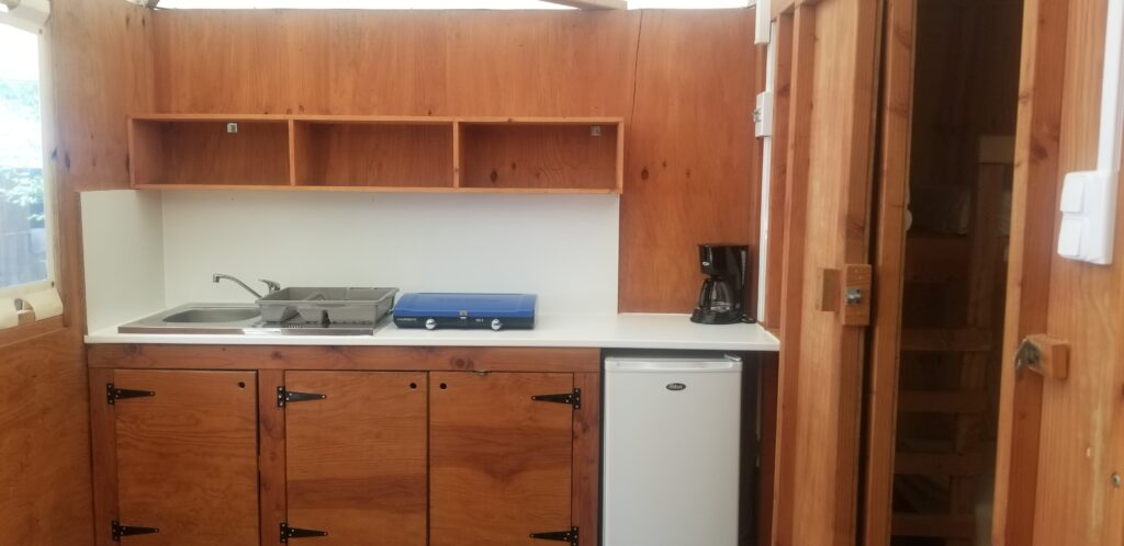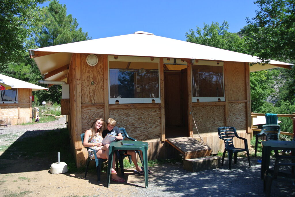 Dans un écrin de verdure et au frais, grâce la proximité avec la rivière, profitez de l'esprit camping sans avoir besoin de prévoir votre tente. Nos cabanes équipées en bois et toiles pour 6 personnes, rustiques permettent de se concentrer sur l'essentiel. Esprit nature, vous disposez de 2 chambres de 3 couchages (2 petits lits qui peuvent être rapprochés dans l'une des chambres et d'un lit superposé), d'une cabine privative avec douche, WC et lavabo ainsi que d'un coin kitchenette avec 2 plaques gaz, une cafetière électrique, un évier et le nécessaire de vaisselle. À l'extérieur un espace vous est réservé avec table et chaises de jardin pour profiter de la vue sur les ruines de Cornillon.