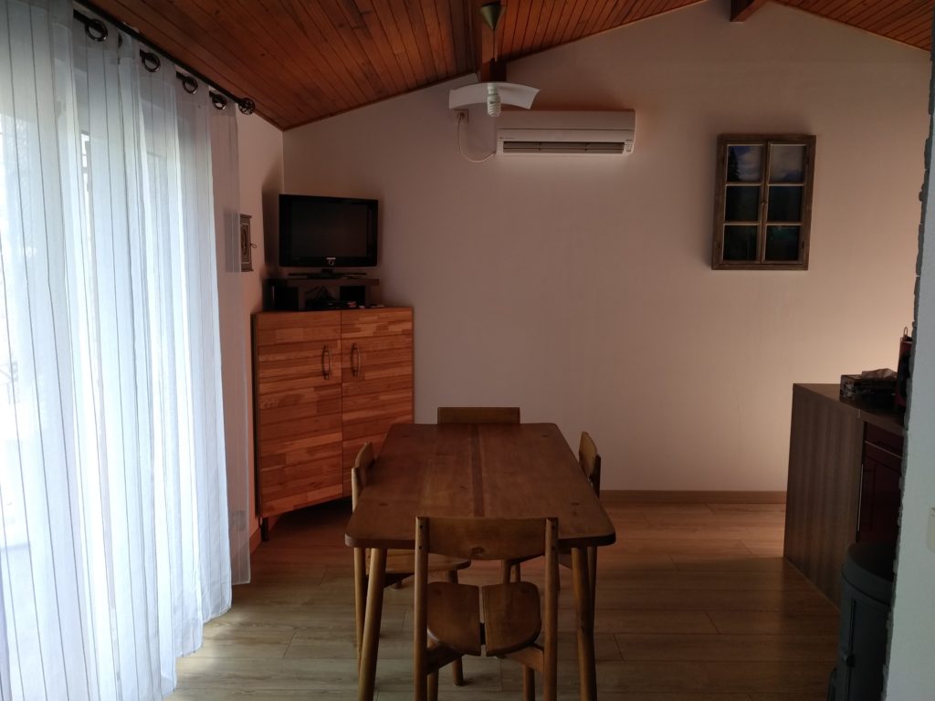 cuisine équipée, séjour avec une table de 4 personnes, chaise haute bébé, Climatisation, tv.