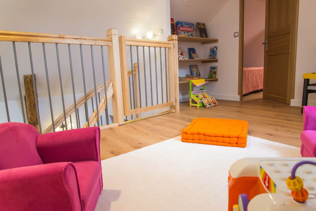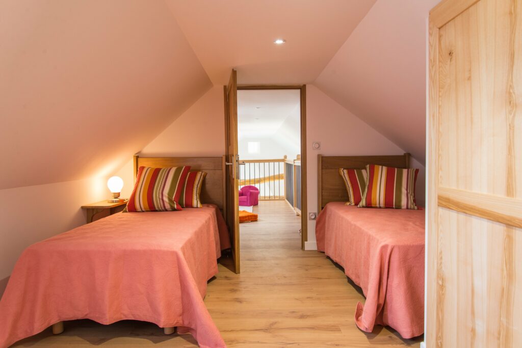 A l'étage : 1 salle de jeux en mezzanine, 1 chambre (3 lit 1 place et salle de bains privative avec WC).