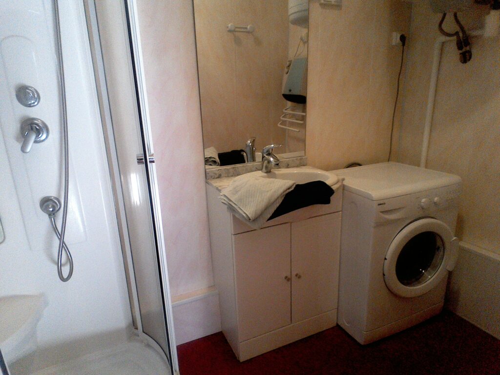 Salle de douche avec étagère, wc.