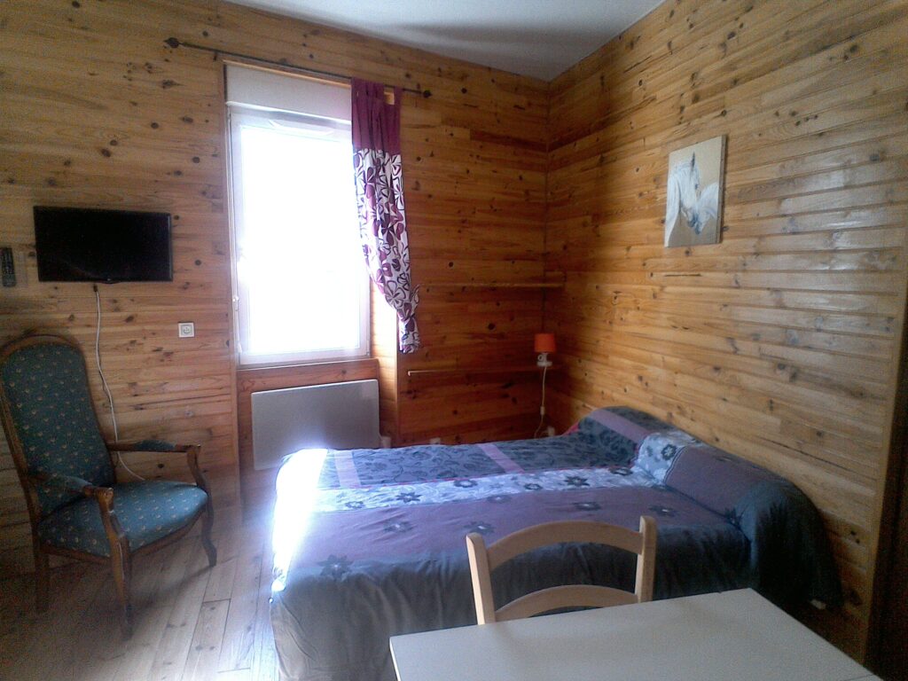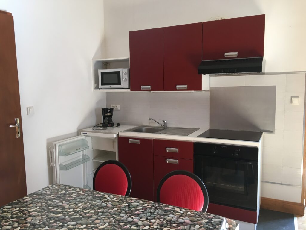 Studio de 22 m² comprenant une pièce de vie avec TV écran plat, un lit en 140 cm, coin cuisine avec frigo/congélateur, four, plaque induction, micro onde, cafetière électrique, lave-linge, grille pain, vaisselle, casseroles ... Aspirateur commun aux 4 appartements.